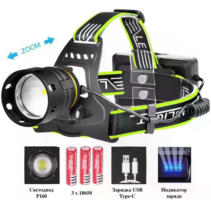 - ☑️ Комплектація: ліхтар, 3 акумулятори типу 18650, шнур Type-C, ремінець на голову.
